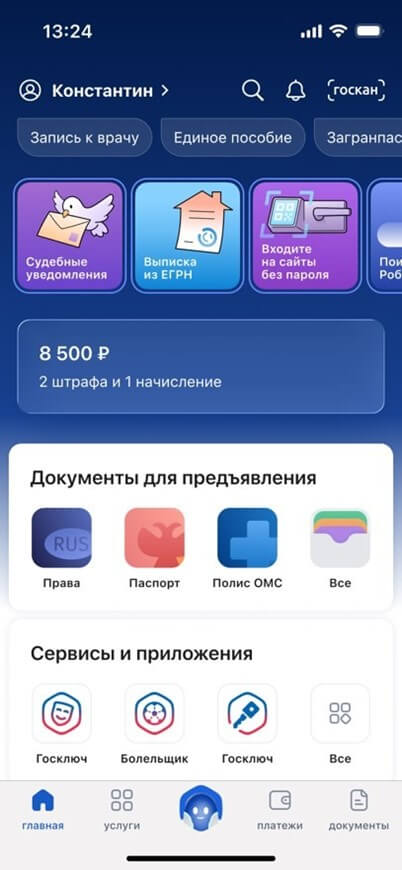 2.1. Открыть приложения «Госуслуги» и нажать кнопку «Госкан» в правом верхнем углу.