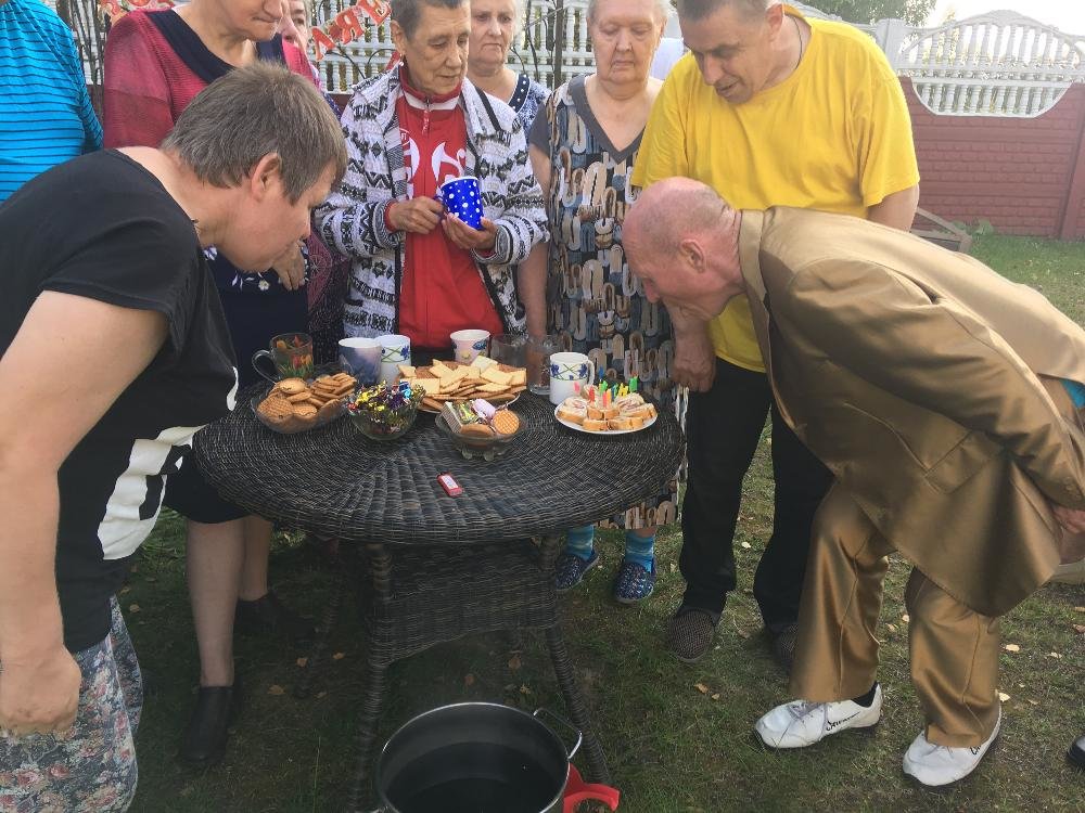 С наилучшими пожеланиями в стихотворной форме поздравили проживающие Кузьмина Л.П. и Новикова Н.А , музыкальный подарок подготовил Мальков А.В. Праздничное мероприятие завершилось чаепитием со сладостями и праздничным концертом .