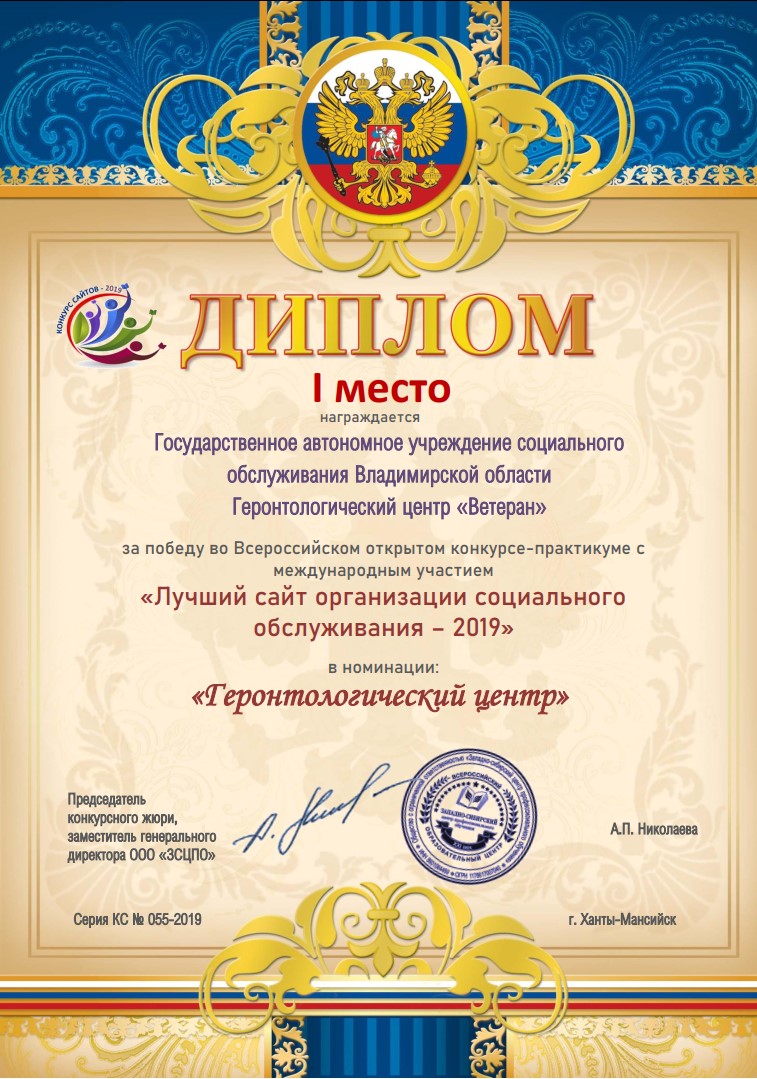 Государственное автономное учреждение социального обслуживания Владимирской области Геронтологический центр «Ветеран» стал победителем во Всероссийском открытом конкурсе-практикуме с международным участием «Лучший сайт организации социального обслуживания – 2019» в номинации «Геронтологический центр».