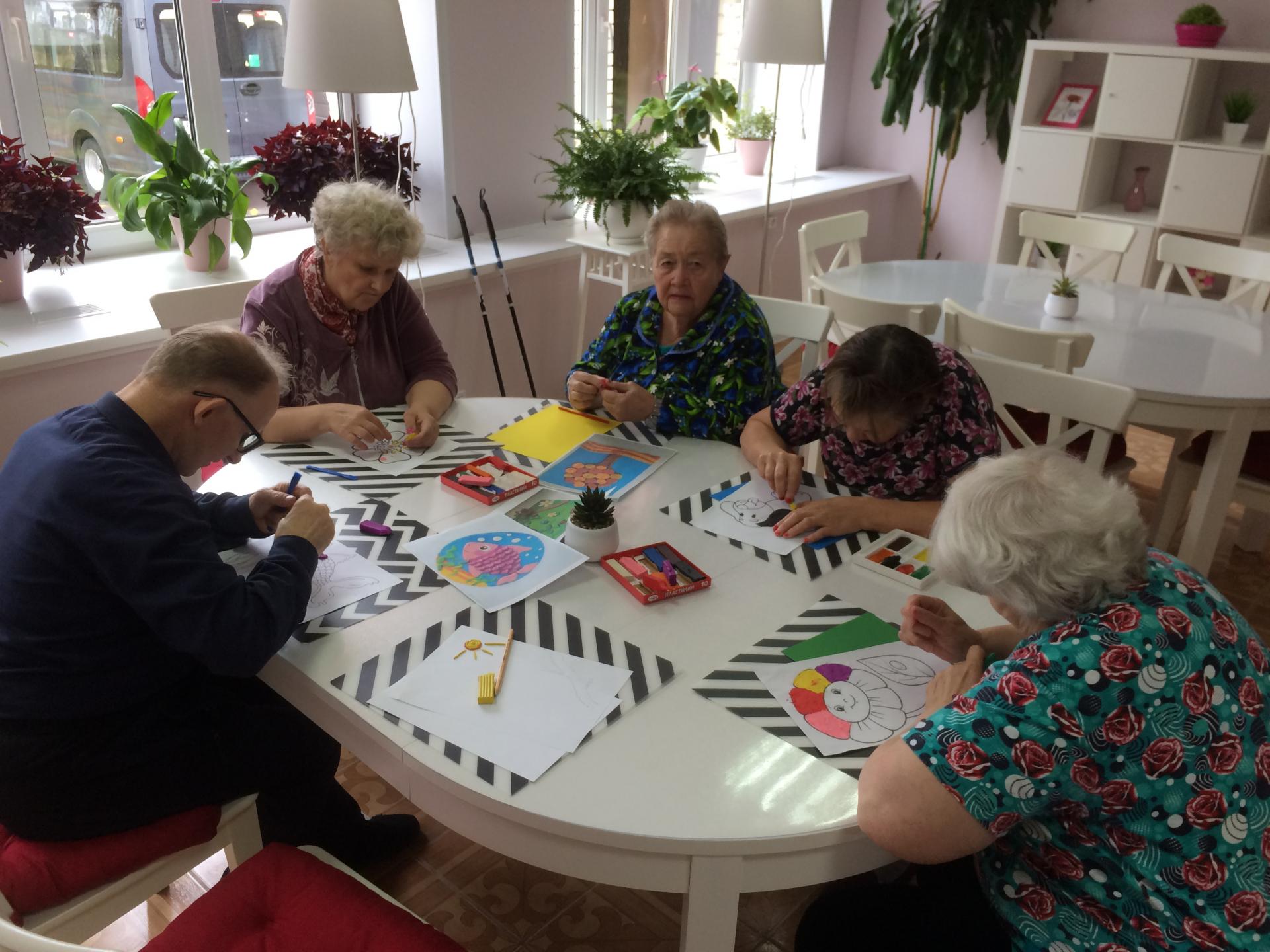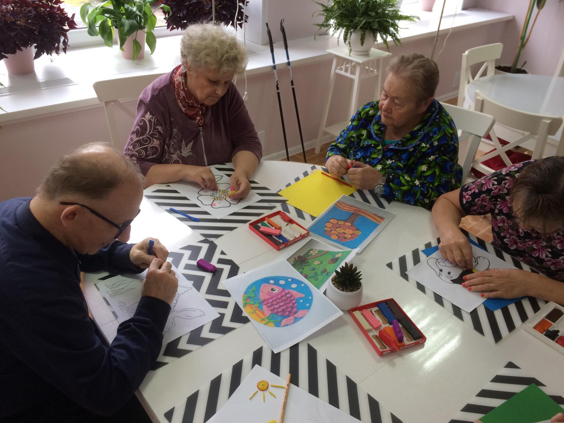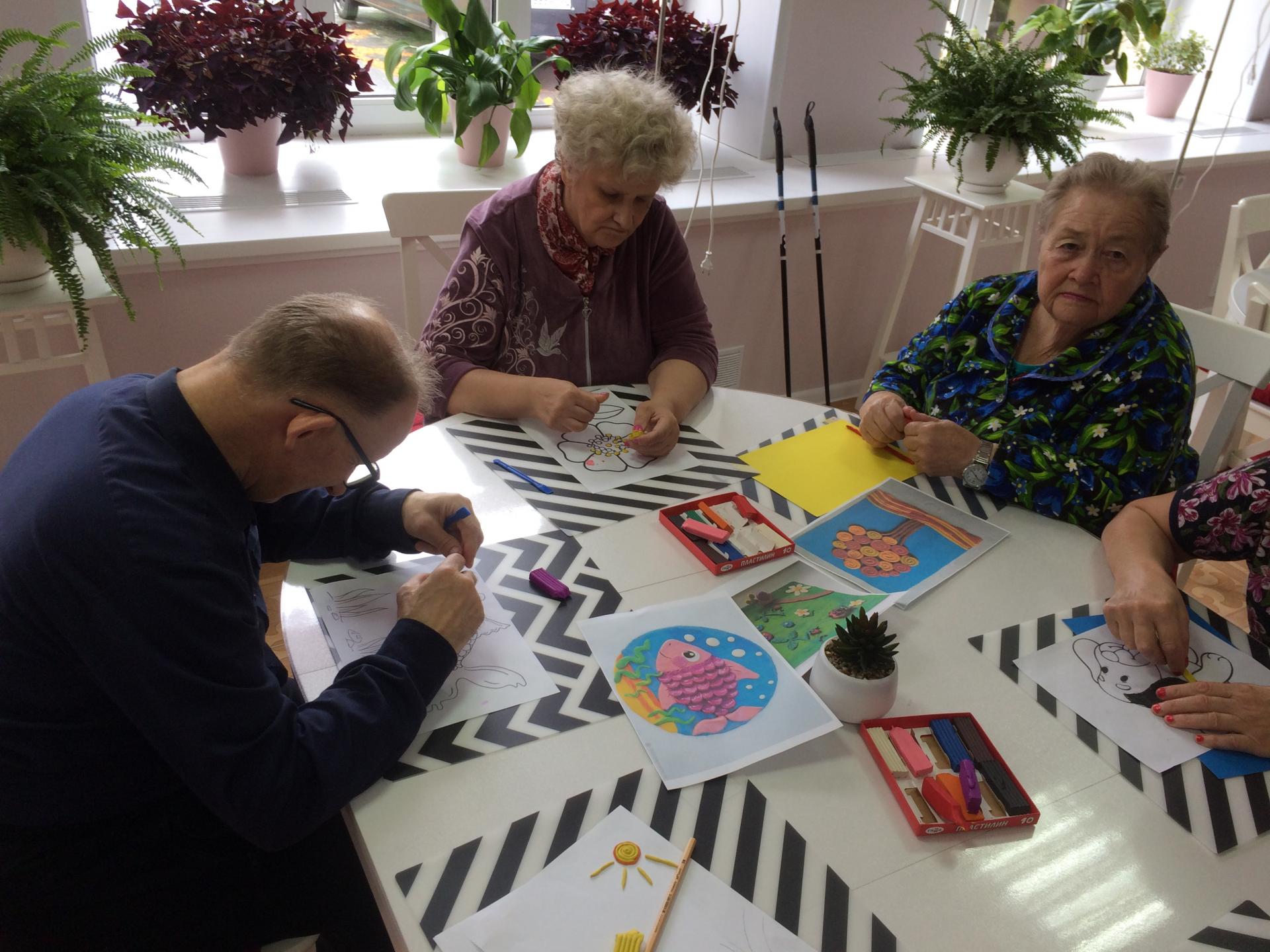 Сегодня в геронтологическом центре «Ветеран» для получателей социальных услуг провели увлекательное занятие лепки. На специальных листах с контурными изображениями живой природы (собачки, цветочки, рыбки и пр.) необходимо было «раскрасить» рисунки пластилином.