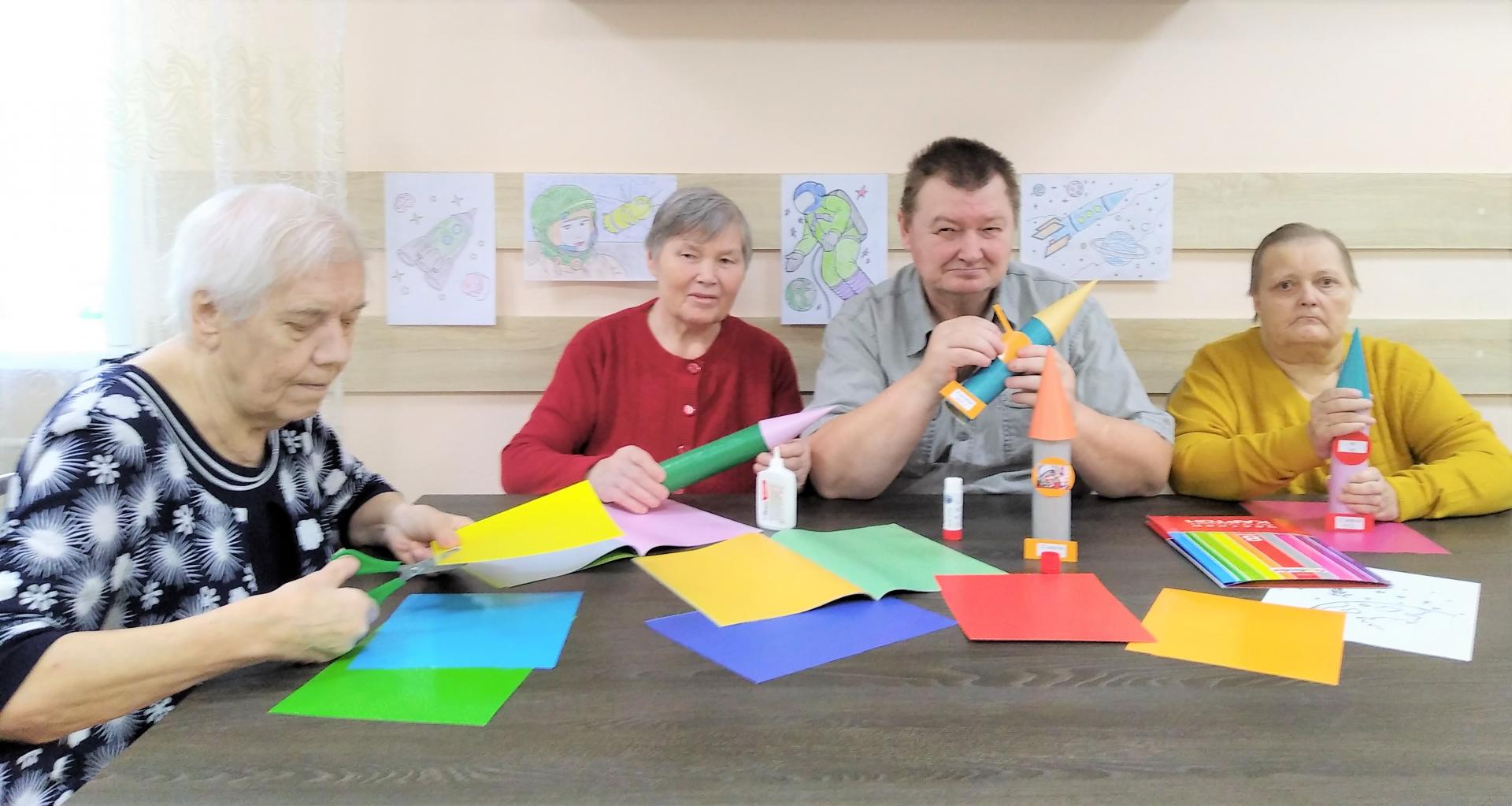 С получателями социальных услуг психоневрологического отделения «Ветеран» было проведено развивающее занятие, посвященное 60-летию первого полета человека в космос. Проживающие вспомнили основные этапы освоения космического пространства, пилотов космических кораблей, крылатые выражения космонавтов; показали свои знания и умения при выполнении творческого задания. Получившиеся ракеты можно использовать на следующих развивающих занятиях, а также пополнять коллекцию новыми экспонатами.