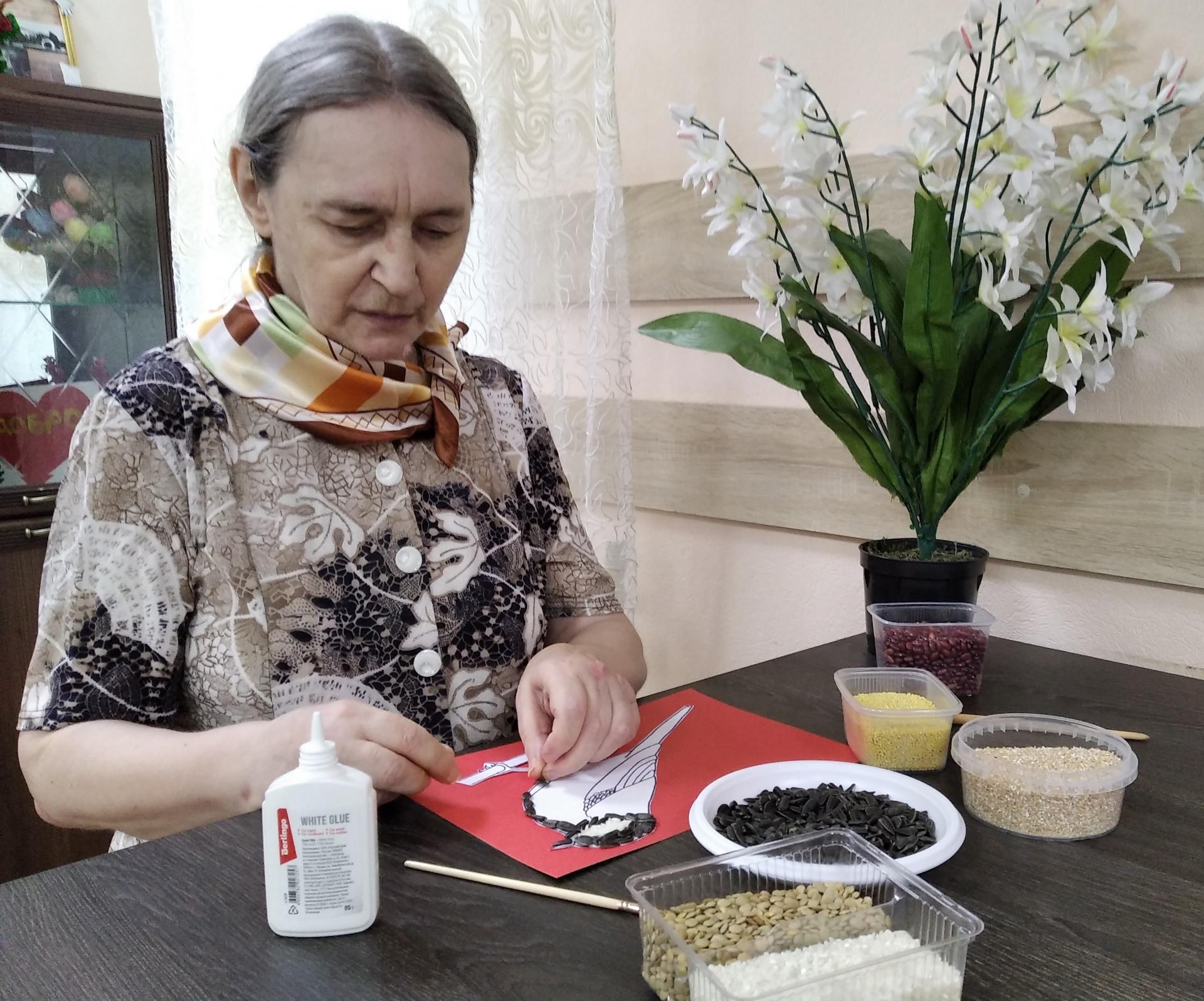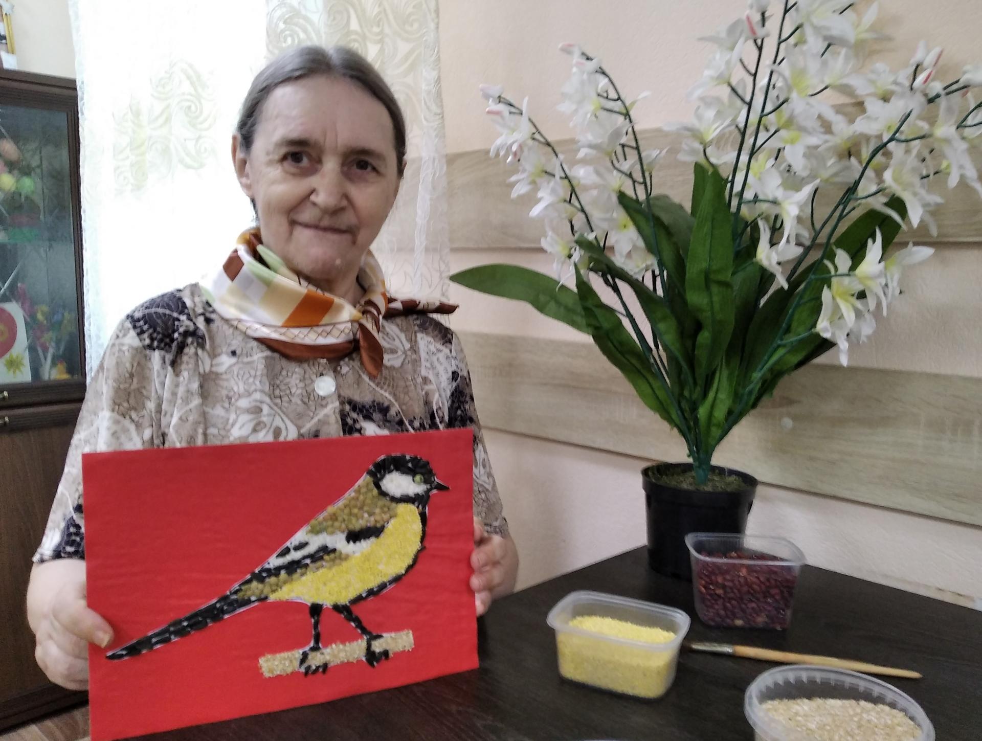 Рисование крупой способствует развитию координации движения рук, мелкой моторики, внимания, воображения, а также оказывает успокаивающее действие. Во время работы с рисунком проживающие вспоминали названия птиц и слушали их пение в аудиозаписи, обсуждали какую крупу лучше выбрать. Все художники получили массу впечатлений и остались очень довольны своими шедеврами.