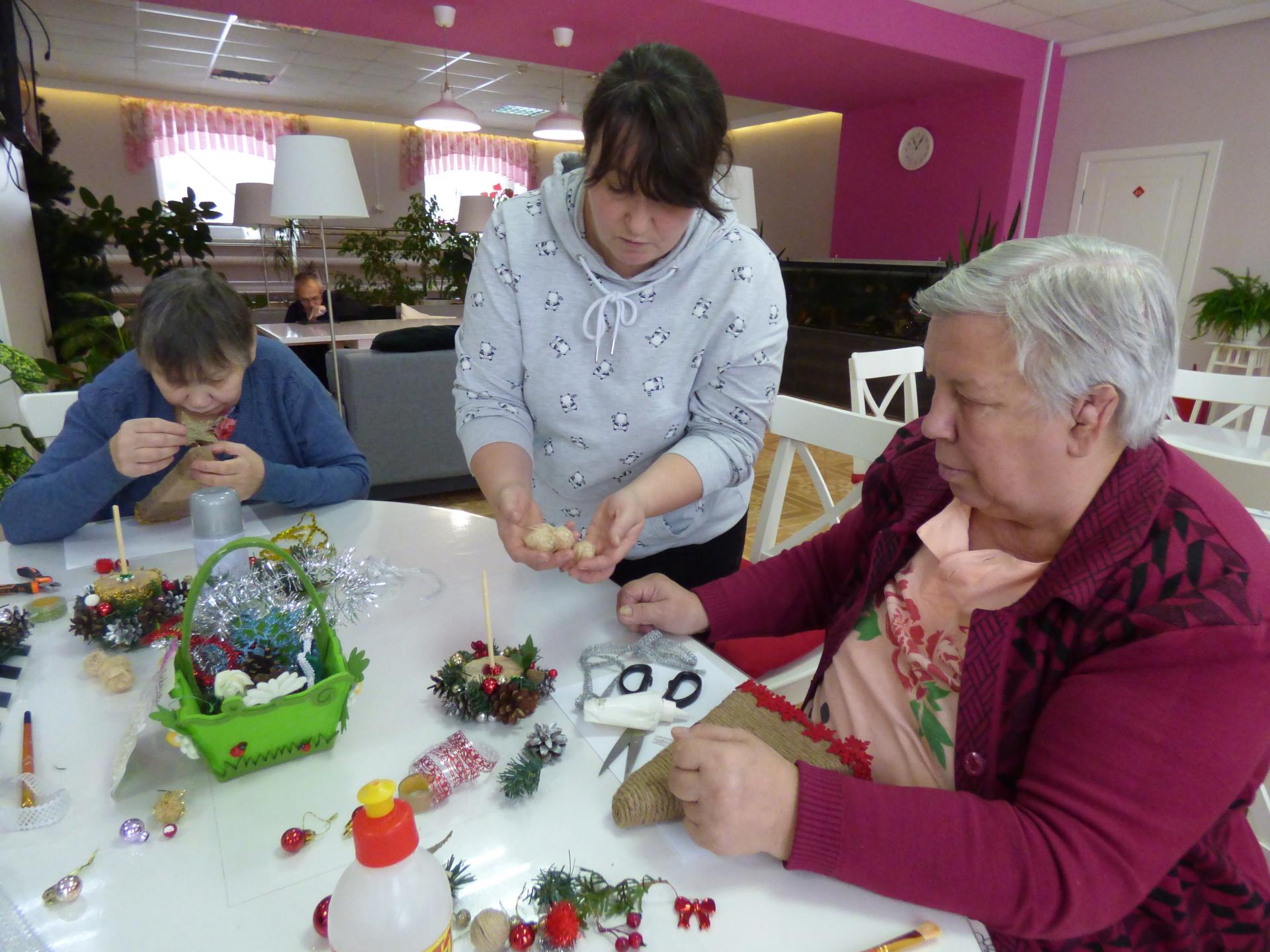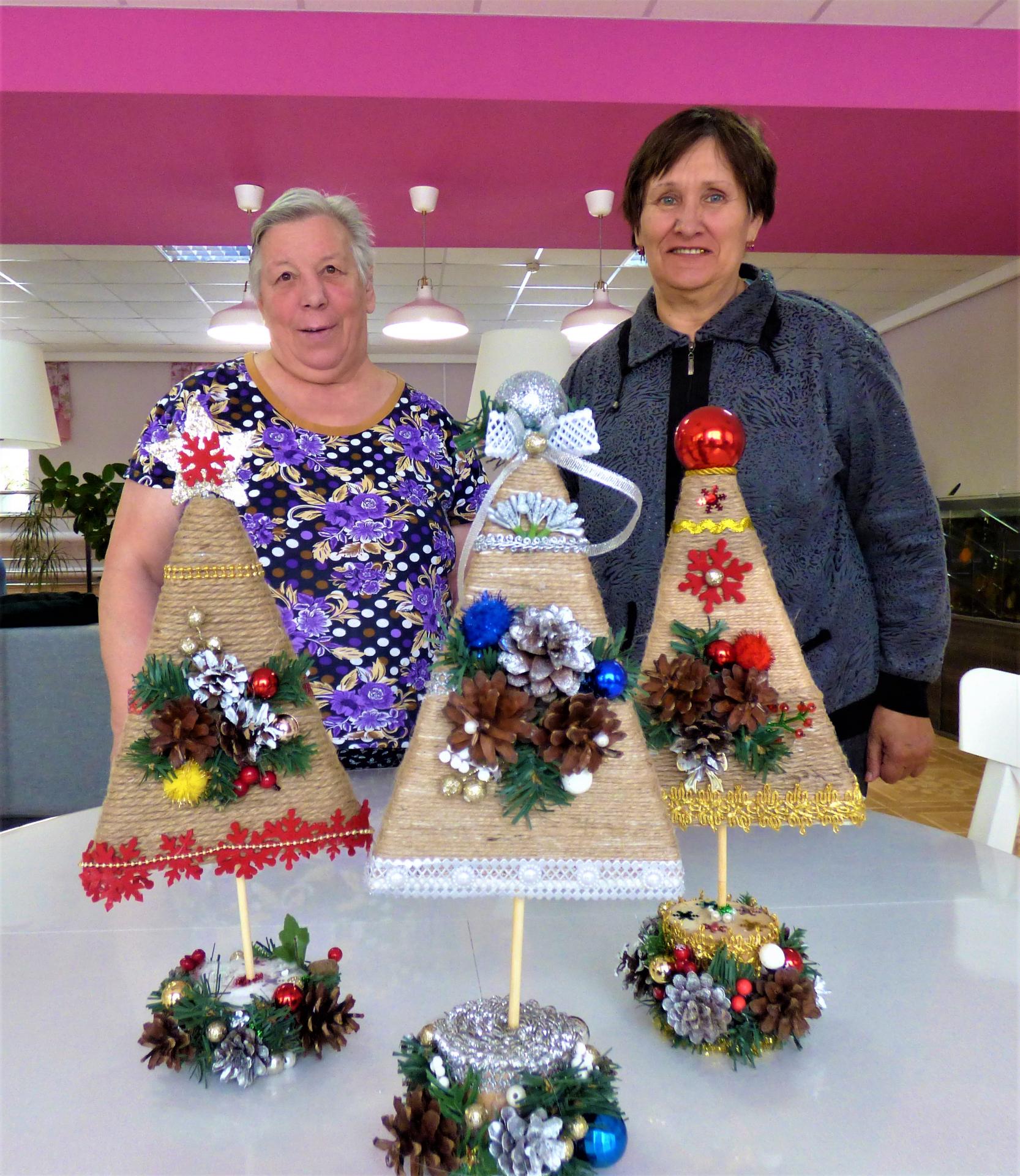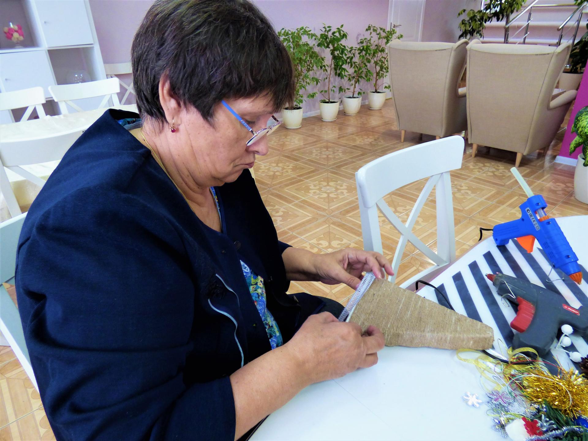 Получатели социальных услуг делали символ Нового года – ёлочку из джутового шнура, природных материалов и декоративных элементов. Такое занятие хорошо развивает мелкую моторику людей пожилого возраста, а также тренирует их память.
