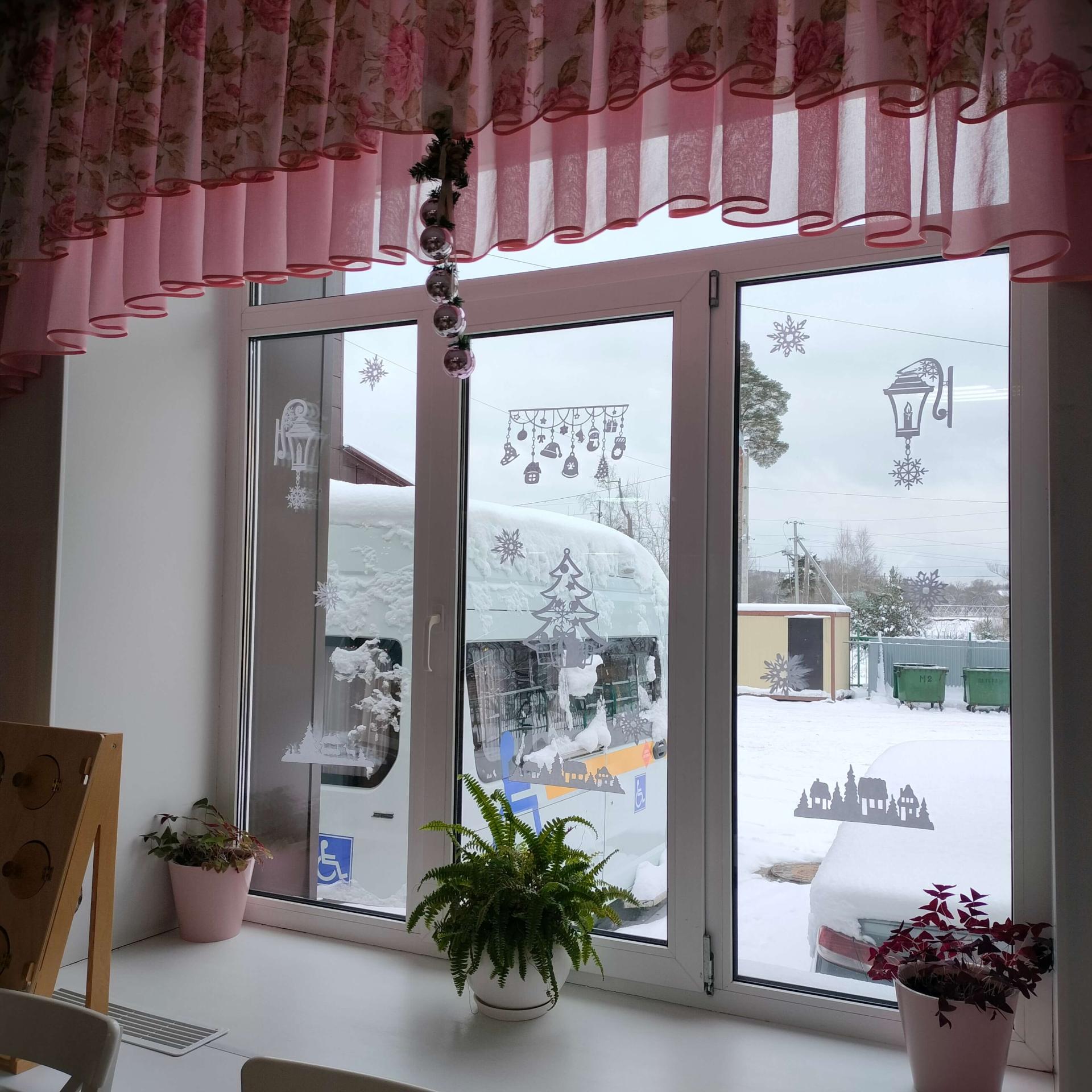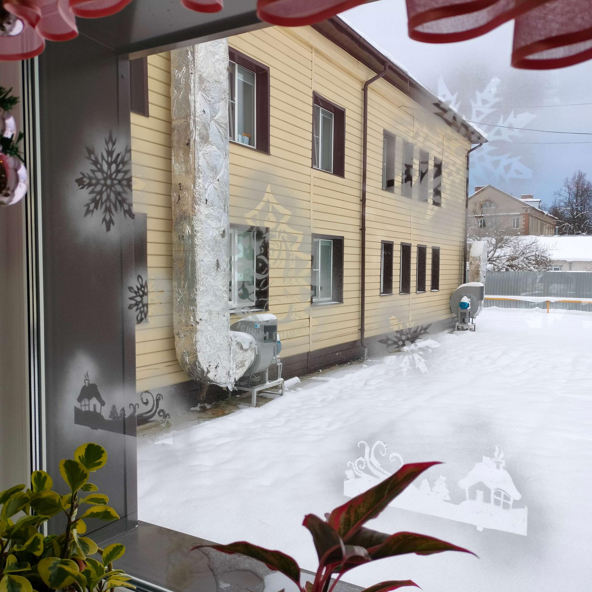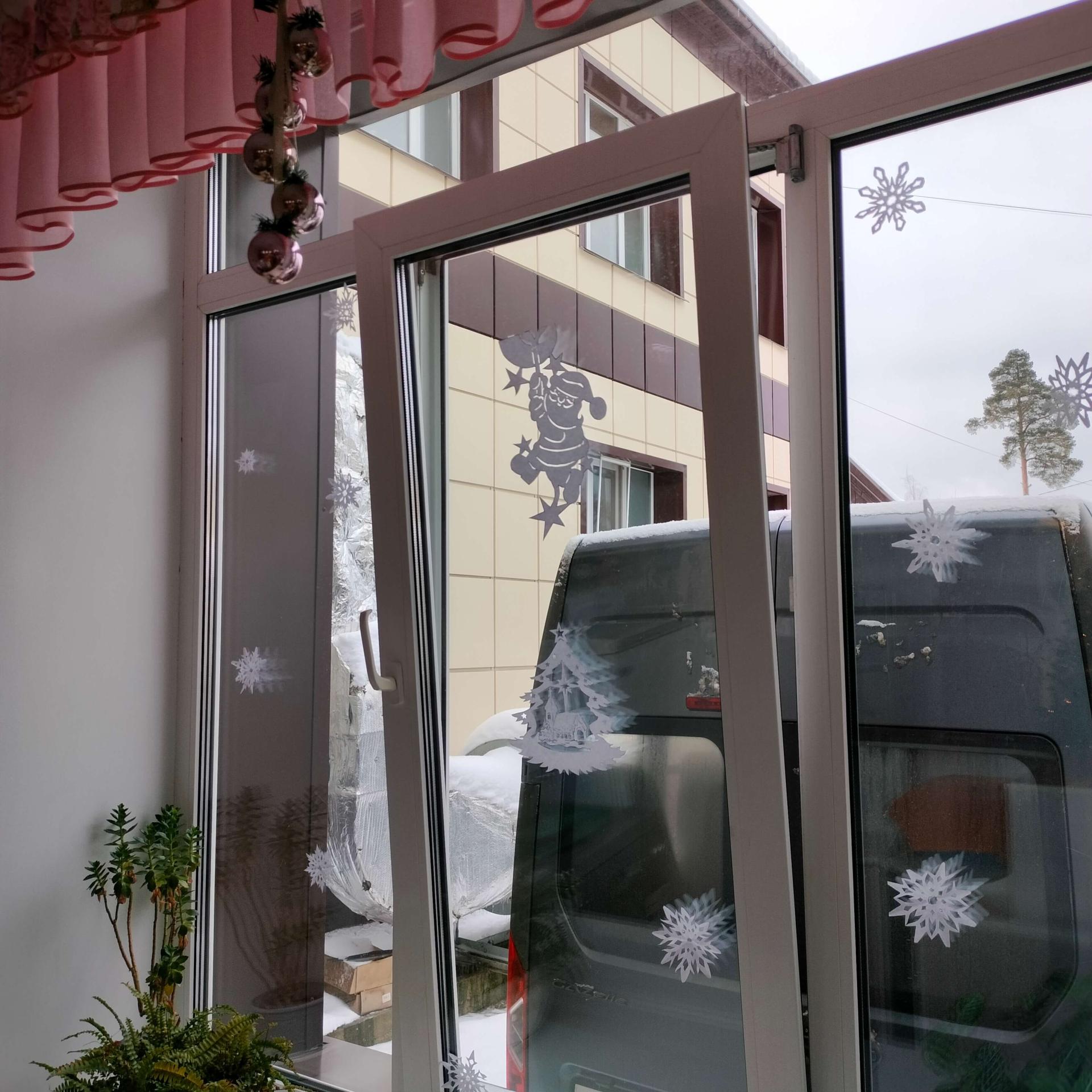 Окна центра украсили яркими гирляндами, милыми рождественскими веночками и блестящими снежинками. На стёклах появились изображения зимних пейзажей, заснеженных ёлок и рождественских символов — ангелов, колокольчиков и звёзд. Свет от гирлянд мягко освещал помещение, создавая уютную и праздничную атмосферу.
